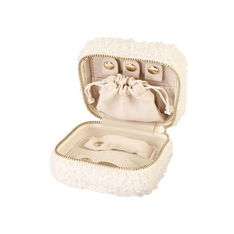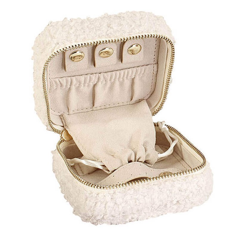 Adoptez cette boîte à bijoux bouclette blanche, un accessoire incontournable ultra mode.
