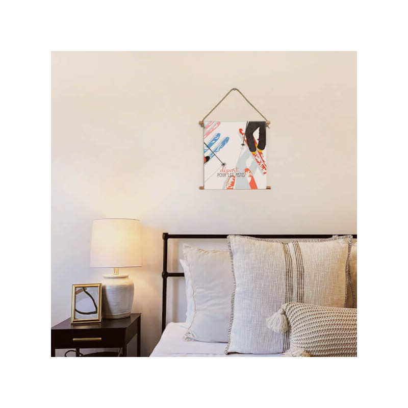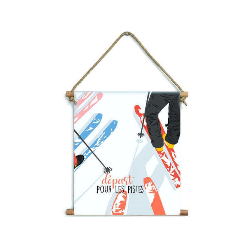 Imprimée sur une toile maintenue par un support en tourillons de bois, cette décoration murale est fabriquée en France.Issue d'une collection illustrant les tranches de vie quotidienne à la montagne enveloppée de son manteau blanc hivernal, chaque visuel raconte une histoire.Descendant des télécabines, plusieurs skieurs se briefent juste avant de partir skier. Au sentiment de liberté absolue face à ces grands espaces enneigés s'ajoute la complicité d’une journée entre amis.