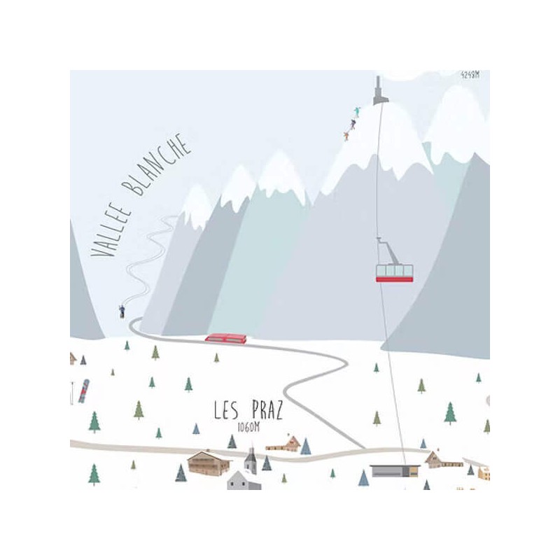 Entre neige et sapins, l'illustrateur croque une enfilade de pistes de ski bordées de sommets blanchis par les flocons de neige éternelles.