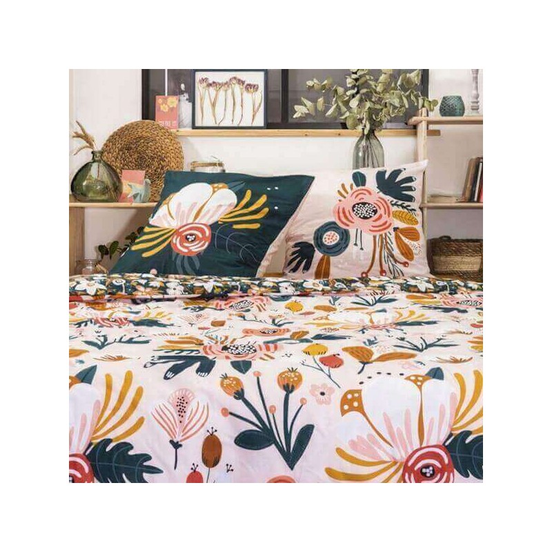 LOREA - Parure de Lit Coton - Imprimé Fleurs - 220 x 240 cm