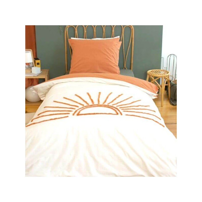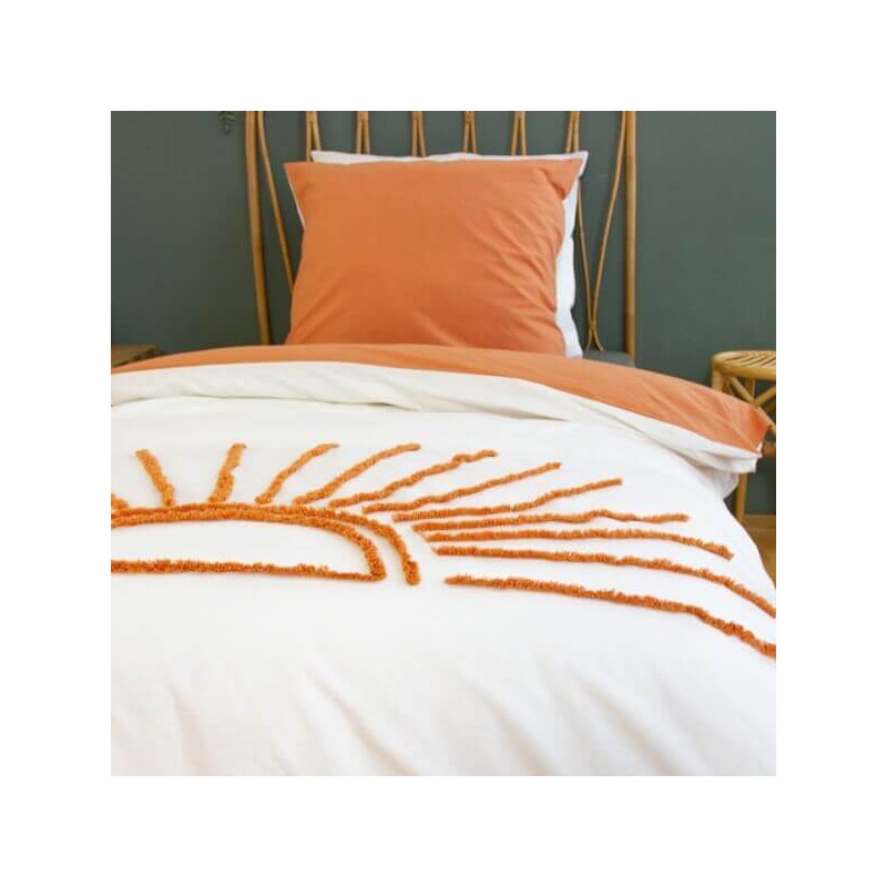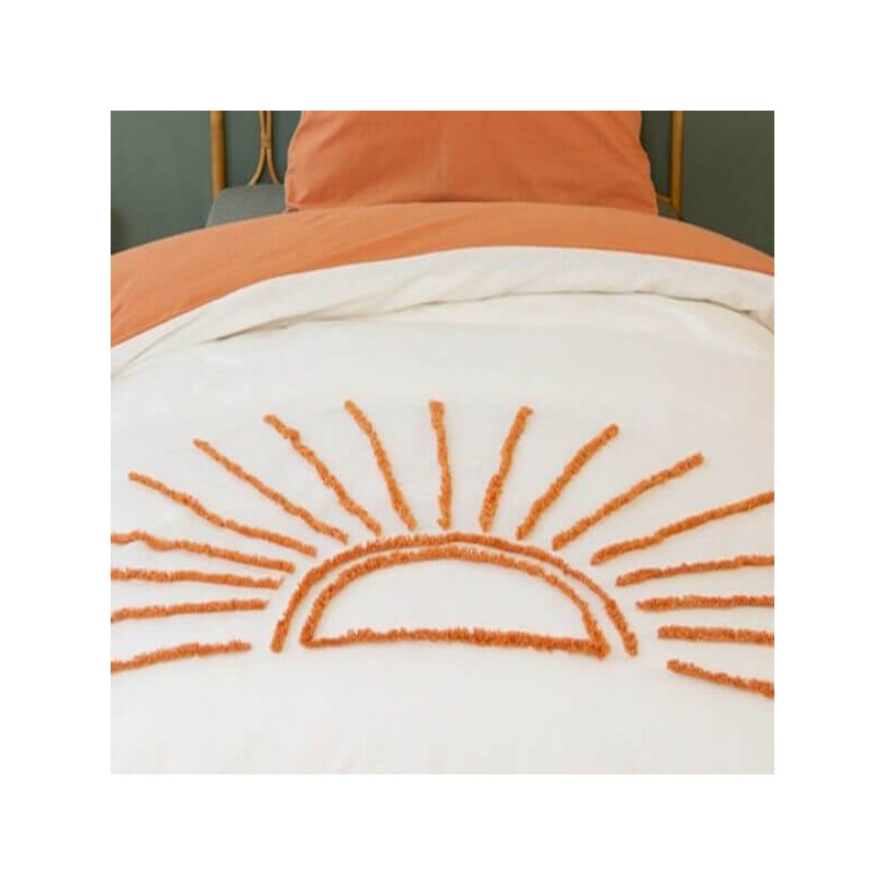 - Composition : 100% coton naturel - Finition : fermeture boutonnée - Motif : demi-soleil tufté ocre orangé sur ivoire - Entretien : lavable en machine à 40°, séchage modéré - Taille : parure junior, 1 housse de couette + 1 taie assortie